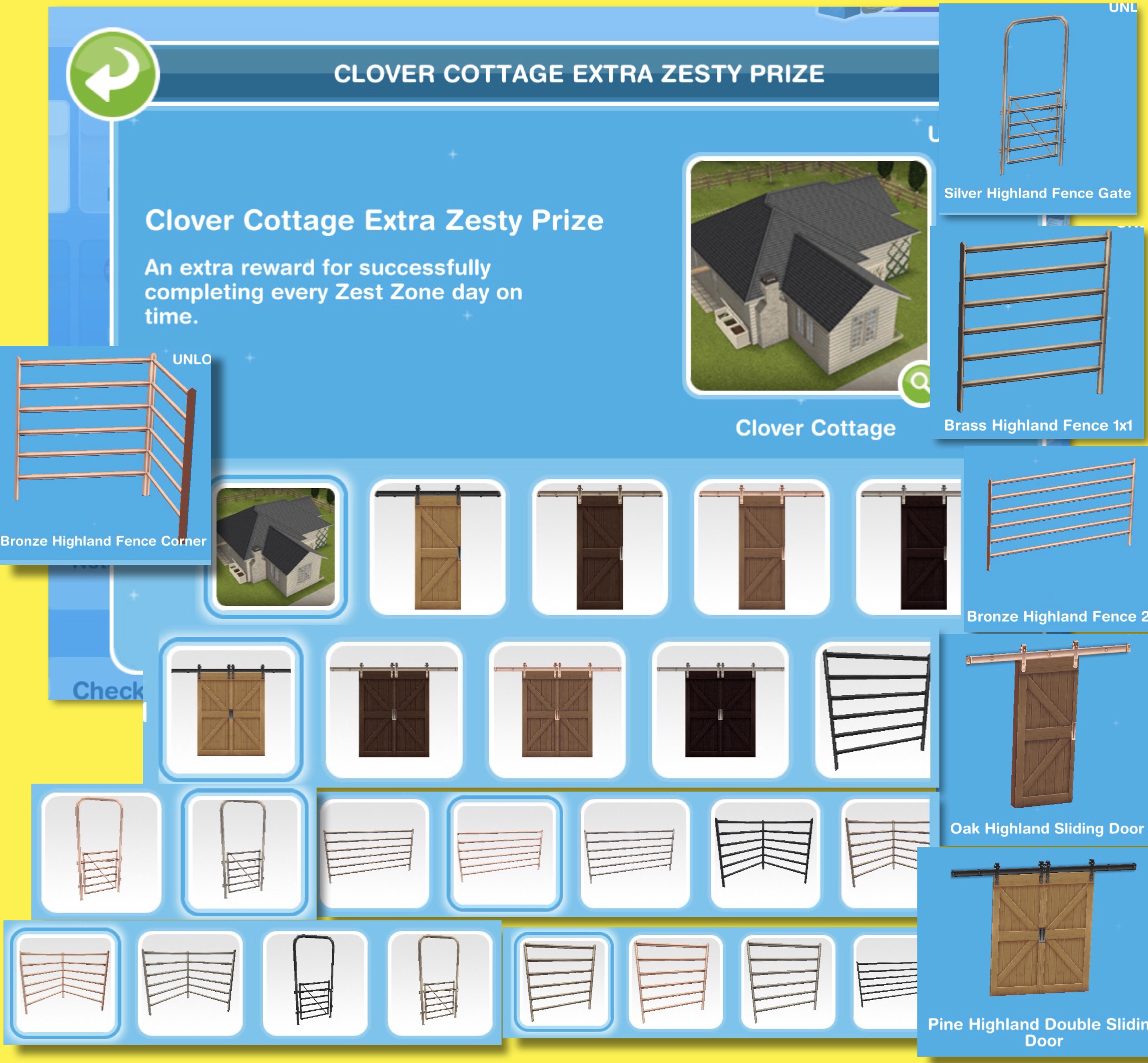 If you complete day’s 11, 12, 13 and 14 (each within 24 hours) you will unlock the Extra Zesty Prizes which contains the Rosebud Ranch house template, corn crops, tractor decorations, outfits and shoes and hats for senior sims: