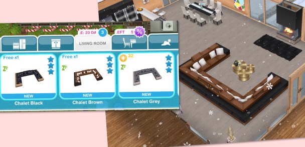 These can be found in the dining room section, the first chalet blonde table is free after that it costs S15,000, the chalet black costs S15,500 and the chalet white costs S16,000. The first four chalet black chairs are free, after that they cost S8,000, the chalet grey chairs cost S8,500 and the chalet white cost S9,000