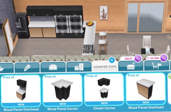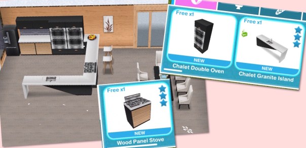 The chalet double oven and chalet granite island can be found in the countertops section (the oven can also be found in the kitchen section) the first of each is free then the oven costs 40SP and the island/sink costs S65,000