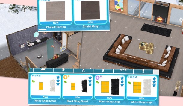 The flooring can be found in the floors section, the first one of each is free, then the Chalet Skirting costs S2,000 and the Chalet Grey costs S150