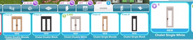 You can also find another new floor, Chalet White Carpet which costs S300, four new doors, two are door frames which cost S500 and S700, the other two are deep wood doors there is a single and double and they both cost S2,500