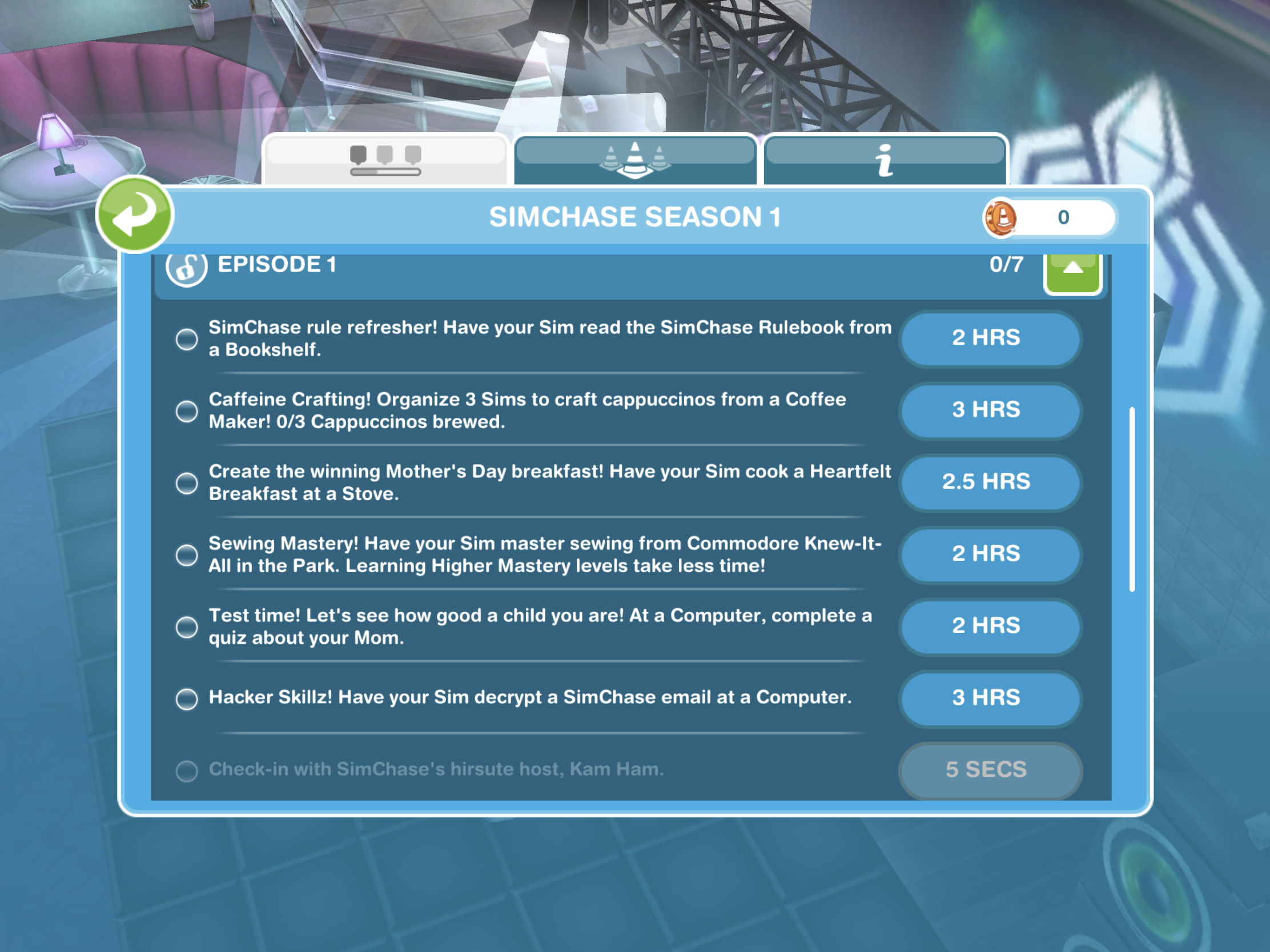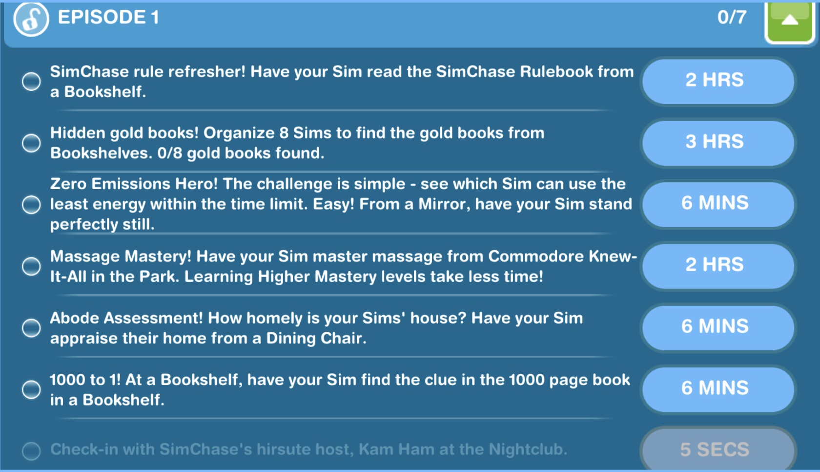 I found it incredibly difficult to write this post as I do not like the idea of SimChase events at all, they are just a complete money grab in my opinion. I completed this on the early access version and I am not even going to try and complete it on my actual game because it is just set up to make us fail unless we spend hundreds of SP! I added up the times for completing episode 7 and it would have taken me 23 hours without SP which is alright for the rival as they don’t need to sleep!! The mastery tasks are what annoys me the most, why should I pay thousands of simoleons or SP to be allowed to complete a challenge? I know they need to make money but they are becoming as bad as The Sims Mobile with their money grabbing actions, being forced to spend money does not make anyone want to spend money!
