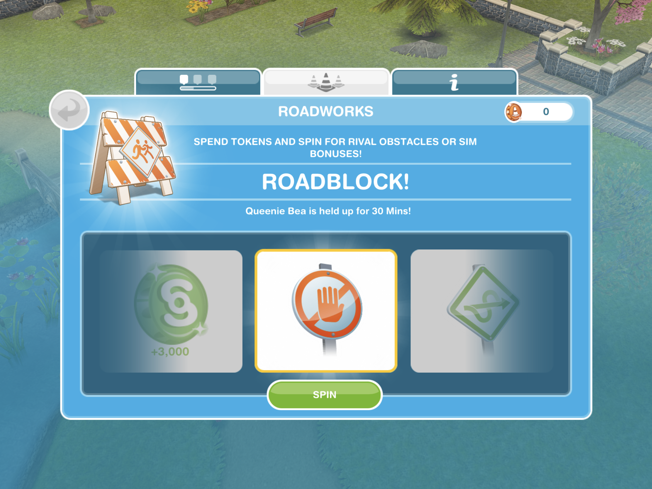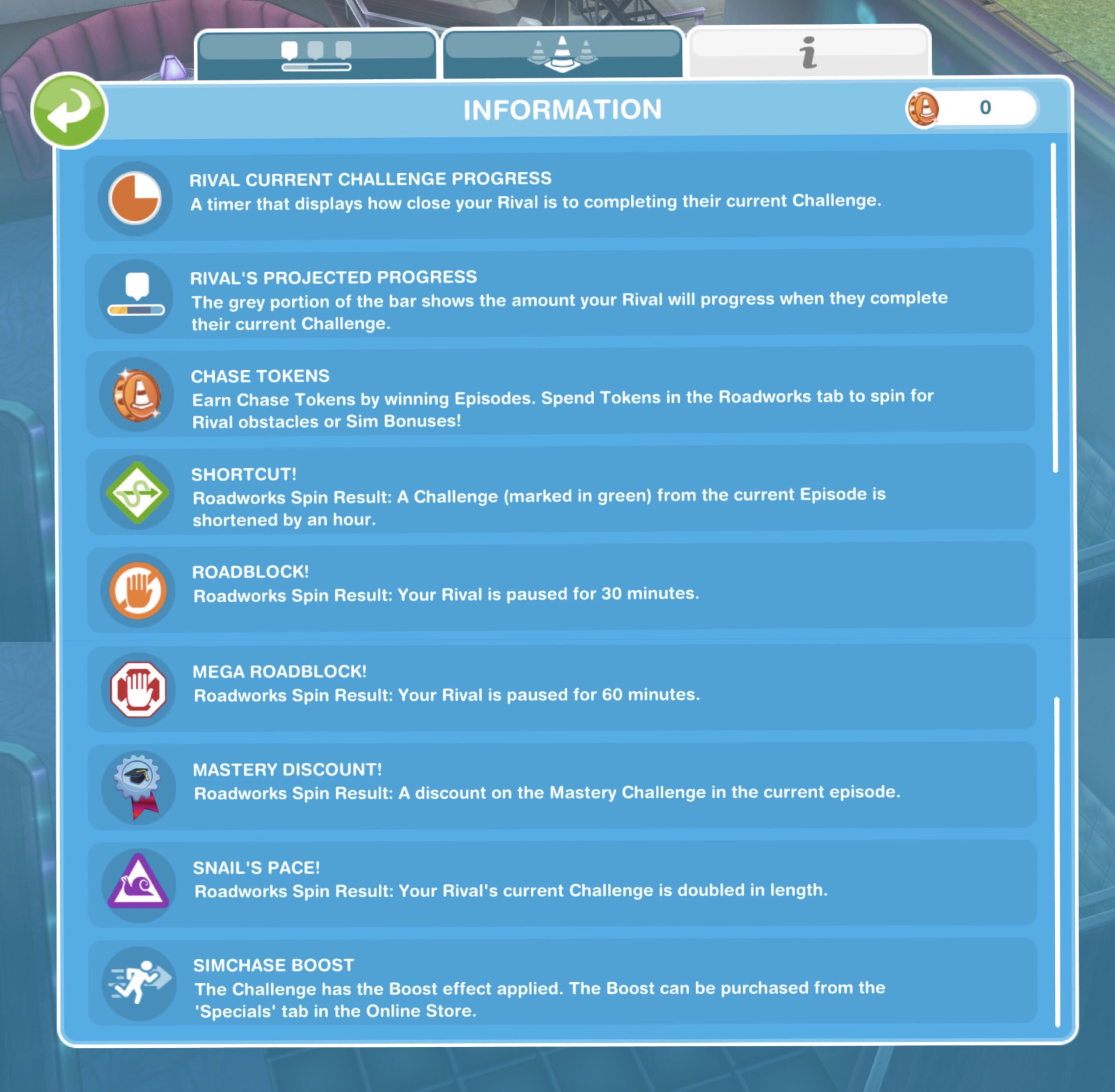 Chase tokens are used on the second tab in the SimChase menu to spin for roadblocks so you can progress faster or you can throw obstacles in the way of your rival sim to slow them down: