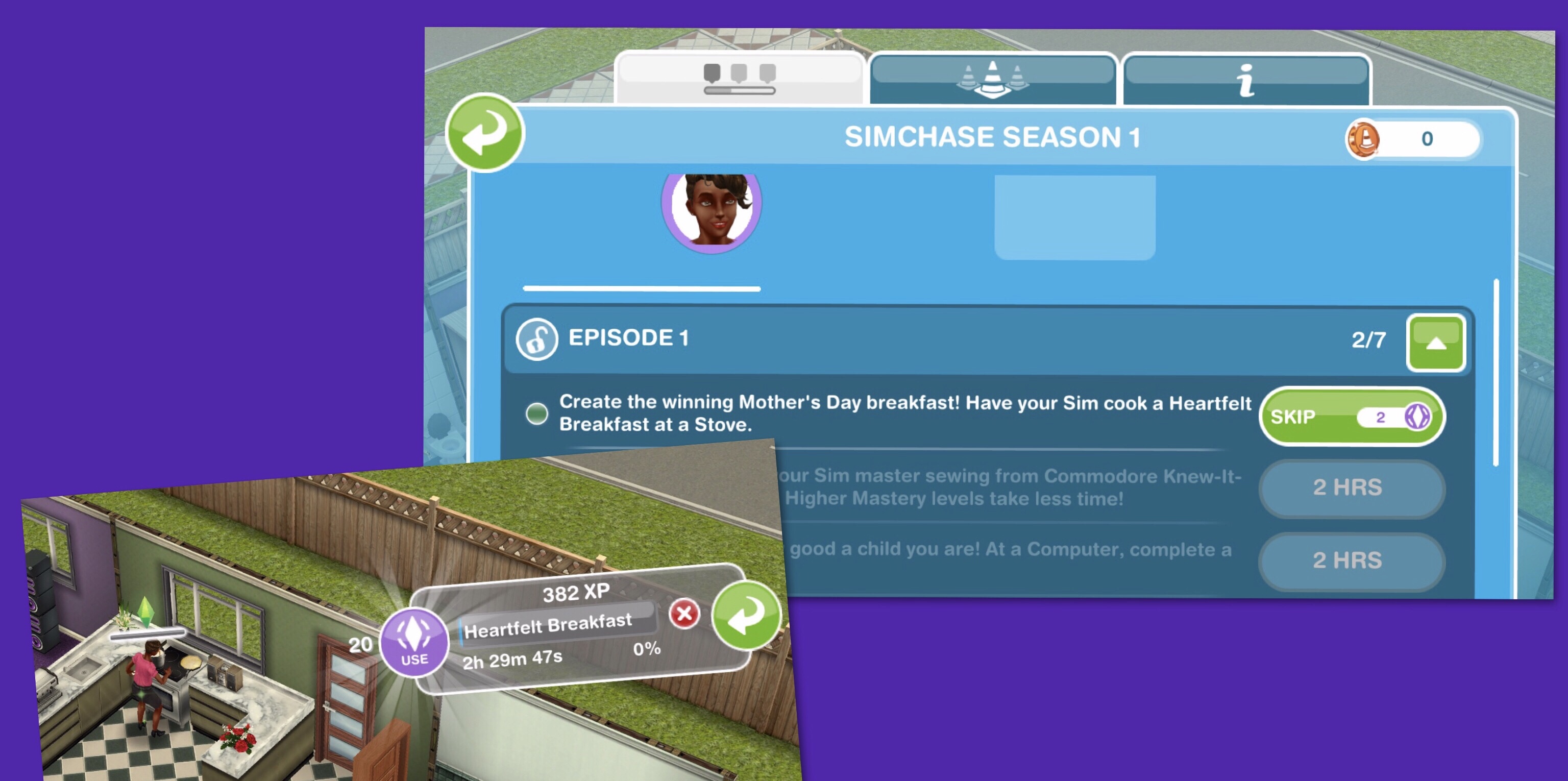 Use social points sparingly (if you want to) you don’t have to use any at all but if you do, check how much it costs to speed up the task on the sim and the SimChase menu as one will be cheaper! Also if you don’t have a lot of simoleons you can leave the mastery class until last and skip that with SP to complete the episode. I had to do this with episode 8 (due to an internet issue in the night I was behind) I used 25SP to skip episode rather than spending simoleons, 38SP or 51SP on the mastery class that would have also taken time to complete