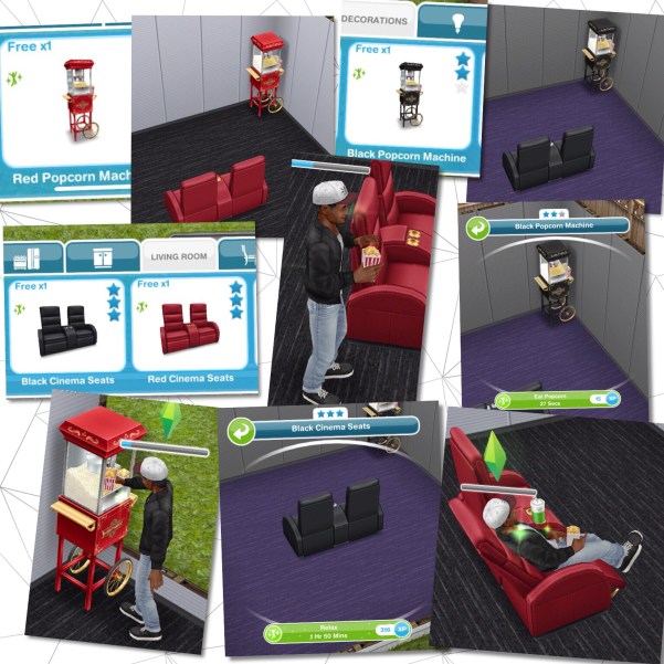 Unlocks Black and Red Cinema Seats which can be found in the living room section and Black and Red Popcorn Machines which can be found in the decorations section