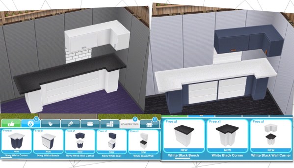 Unlocks Corner, Bench, Wall Corner and Wall Countertops in Navy White and White Black which can all be found in the countertops section