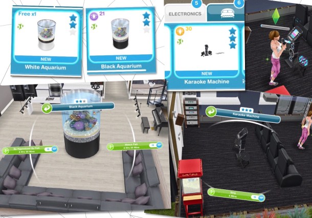 The Karaoke Machine can be found in the electronics section and costs 30LP and the White and Black Aquariums can be found in the decorations section, the first White Aquarium is free then they cost S135,000 each and the Black Aquarium costs 21SP