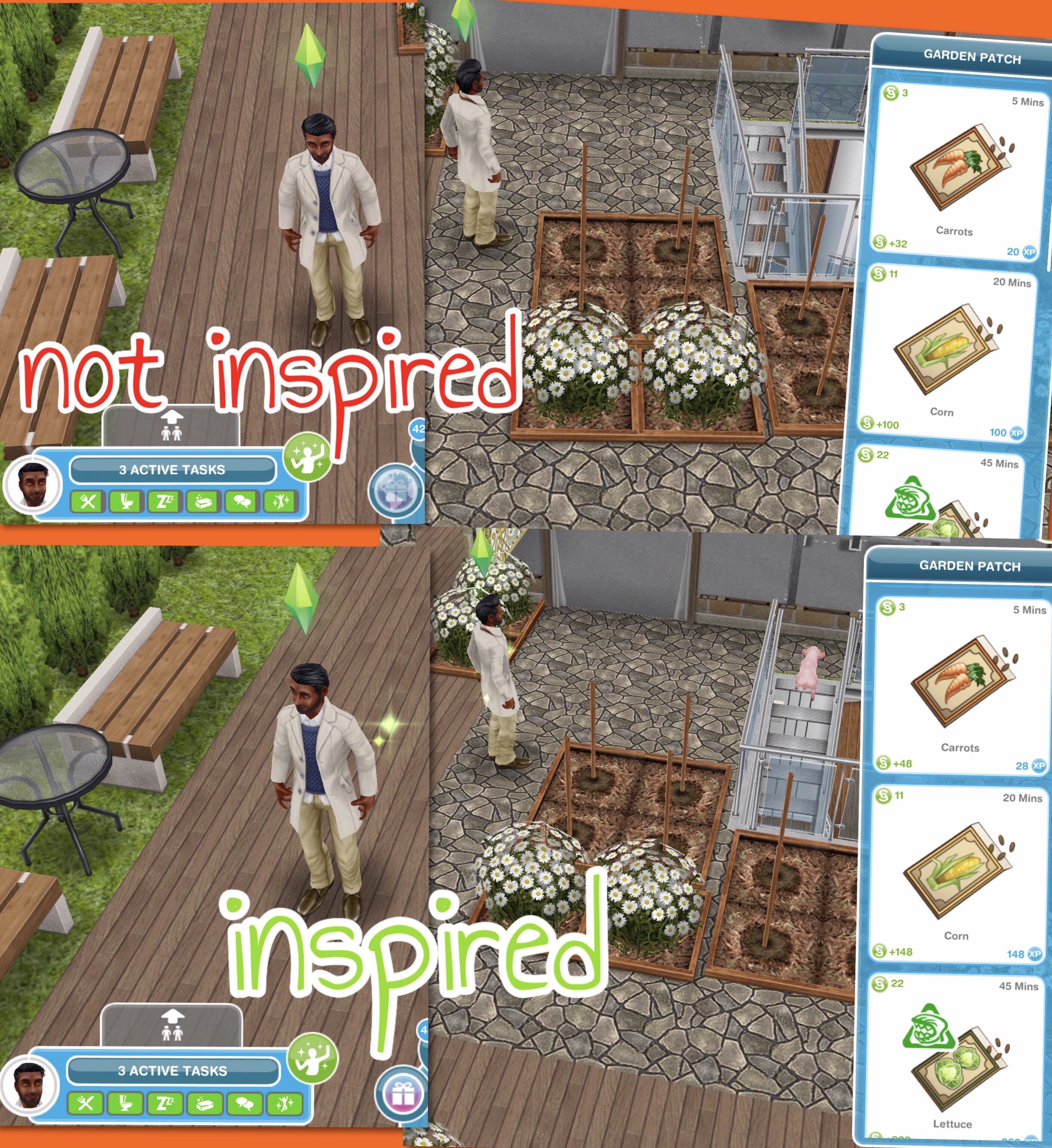 We are going to continuously grow carrots using 10 sims every 5 minutes. As you can see in the image above sims will earn S48 growing carrots when inspired compared to S32 normally (which including the S3 cost for growing them leaves your sims with S45 each time rather than S29)