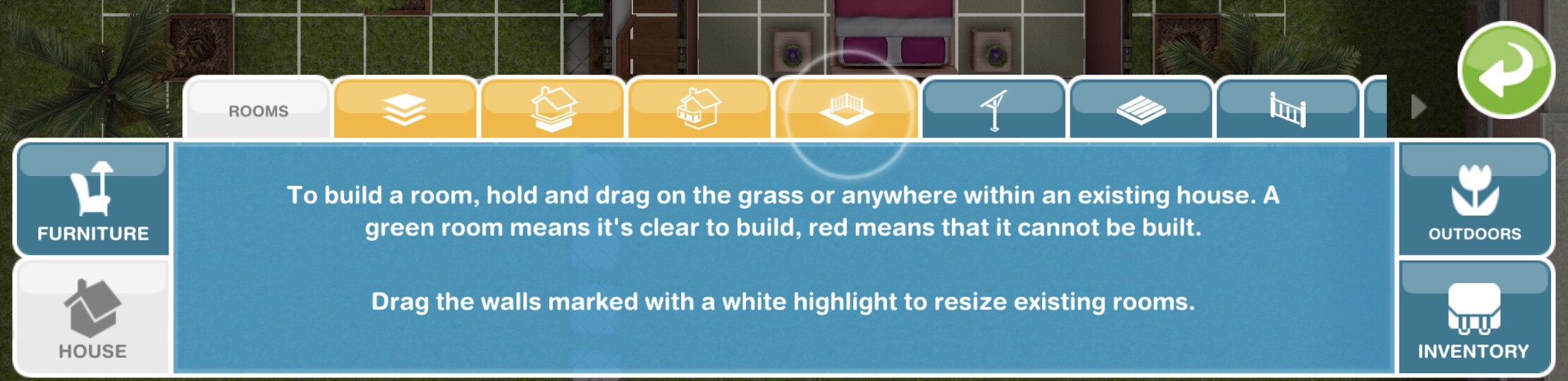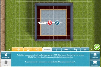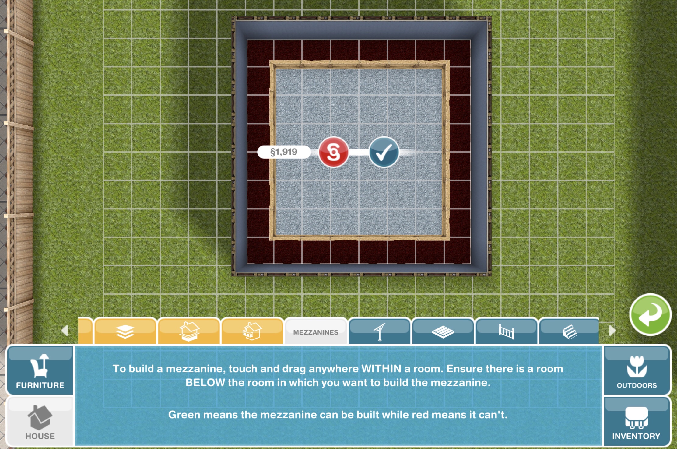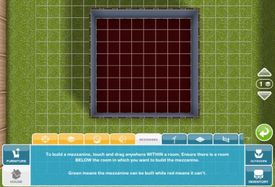To build a mezzanine, touch and drag anywhere WITHIN a room. Ensure there is a room BELOW the room which you want to build the mezzanine. Green means the mezzanine can be built white red means it can’t.