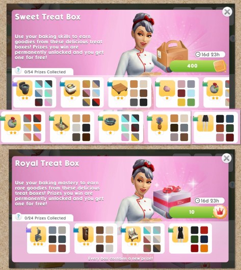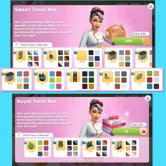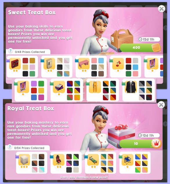 There are 48 Sweet Treat Boxes to open with 400 Sweet Treat Tokens each time and 24 Royal Treat Boxes to open with 10 Royal Treat Tokens each time: