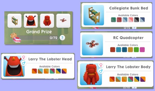 If you unlock all the boxes (72 in total) you will unlock the grand prizes which are the Collegiate Bunk Bed, Larry the Lobster Head and Body and RC Quadcopter: