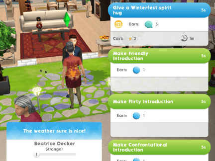 1.Sing carols with 3 other sims- 5 seconds, costs 3 energy each Reward: 50 Candy Canes and 1 Winterfest Gift Box