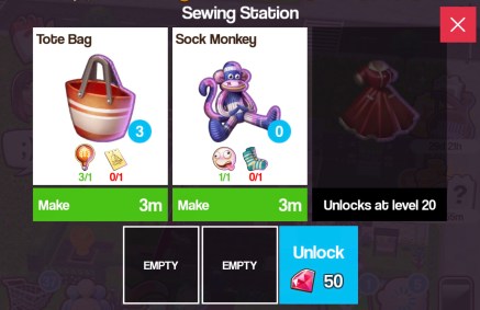 - Own a Sewing Station (buy one from the workstations tab in the shopping cart) Cost: 2,000 coins
