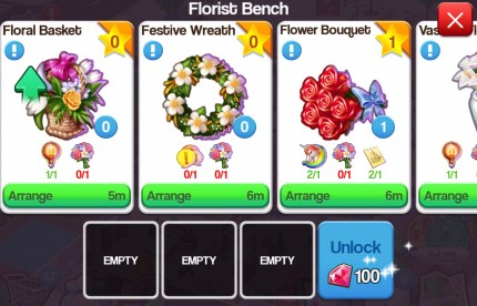 - Buy and place a Florist Bench (buy one from the workstations tab in the shopping cart) Cost: 8,000 coins