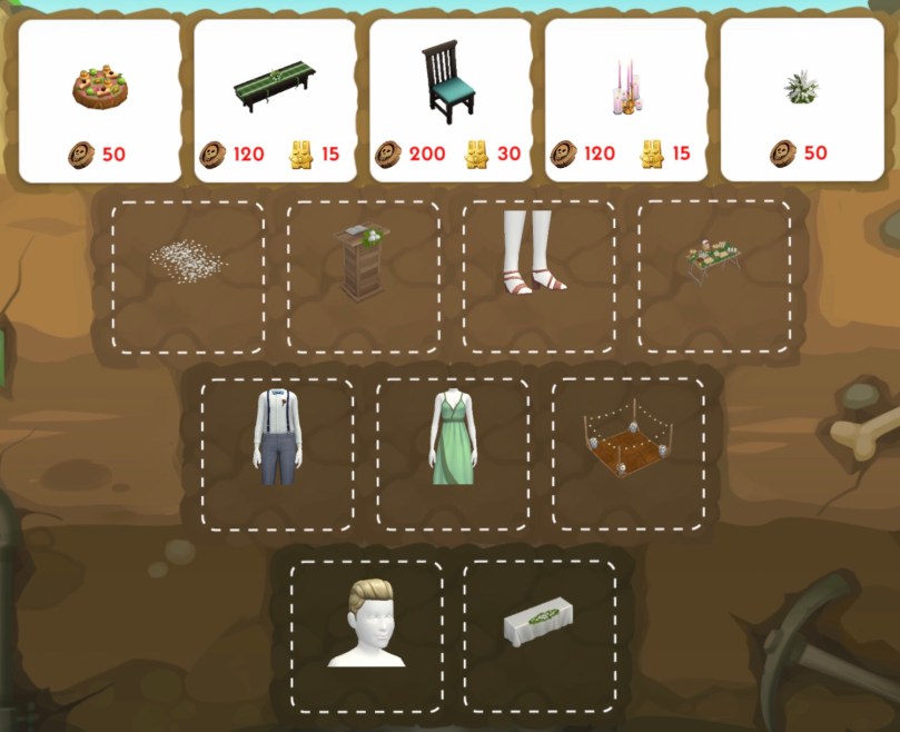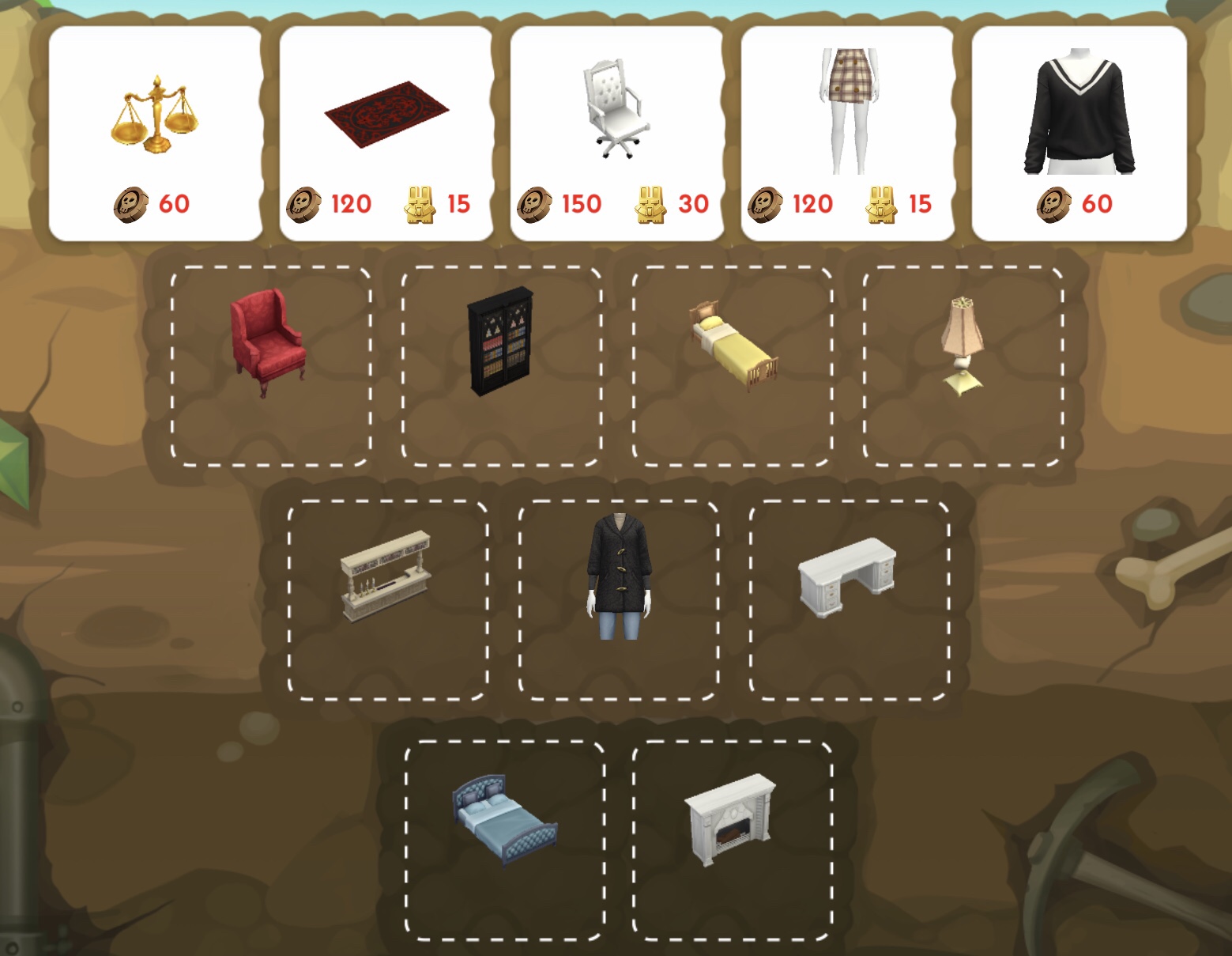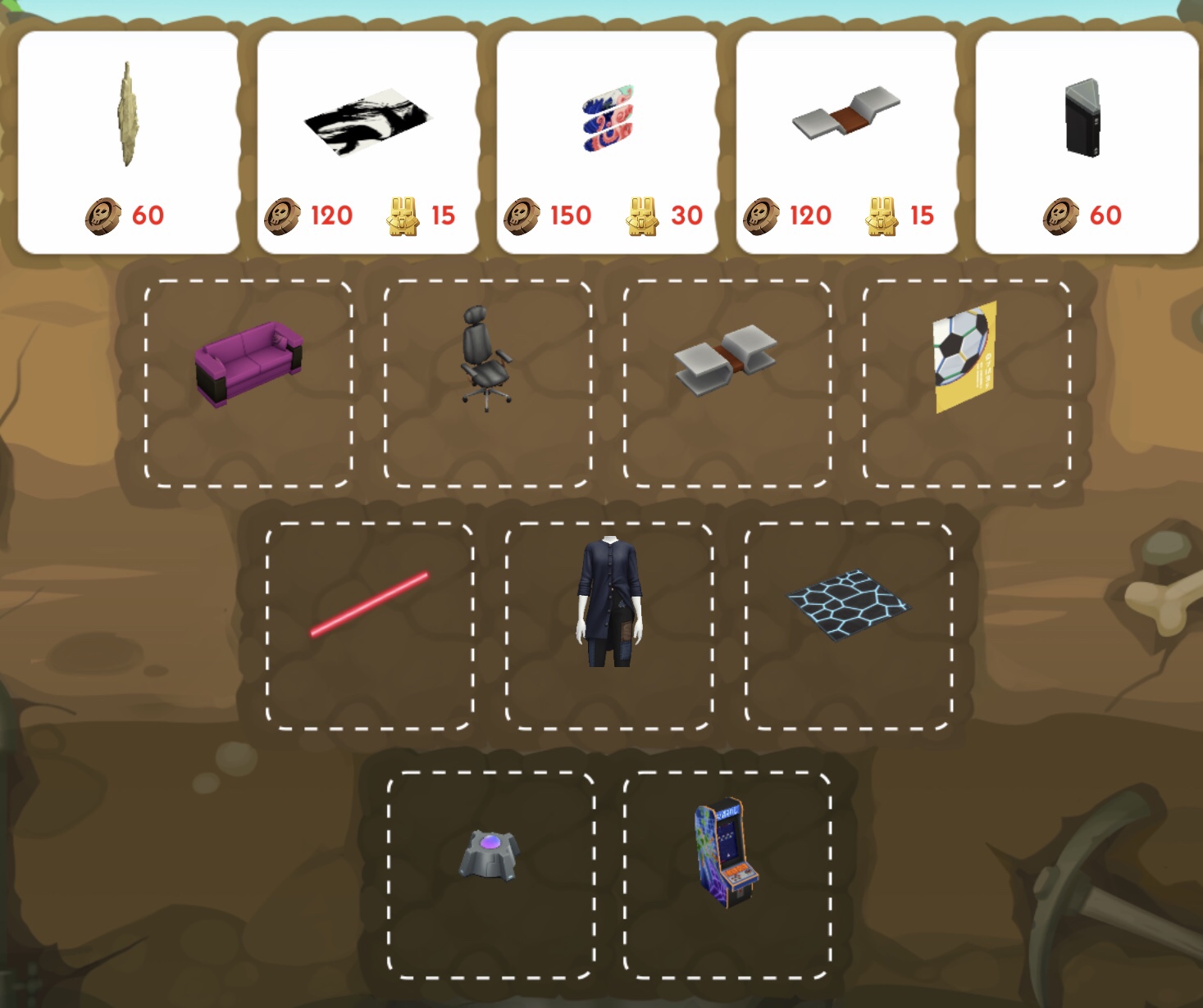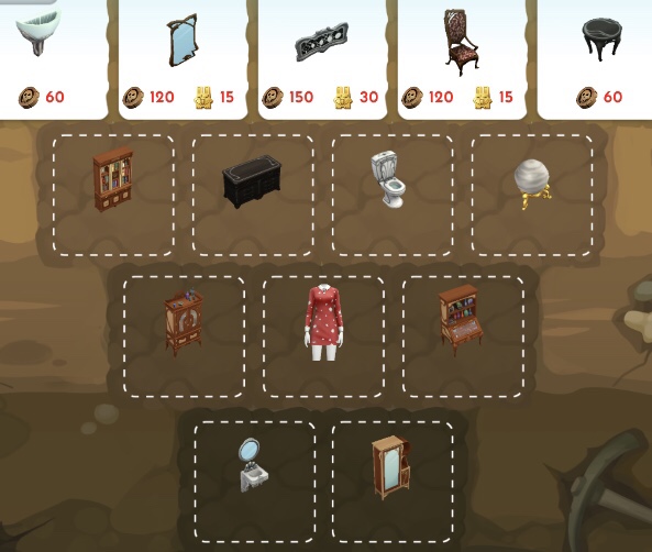 You need to ‘excavate’ the treasure (prizes) from the layer above to uncover and be able to purchase the prize below so the two prizes directly above the item you want need to be unlocked before you can unlock that prize. Prizes that are white can be purchased while brown prizes need to be uncovered first: