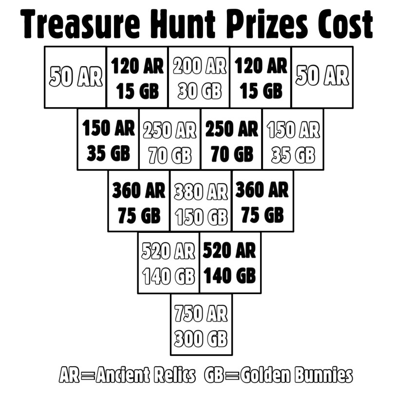 There are 14 prizes you need to uncover by buying with ancient relics and golden bunnies. You need to ‘excavate’ the treasure (prizes) from the layer above to uncover and be able to purchase the prize below so the two prizes directly above the item you want need to be unlocked before you can unlock that prize. Check out my Treasure Hunt guide for more information: