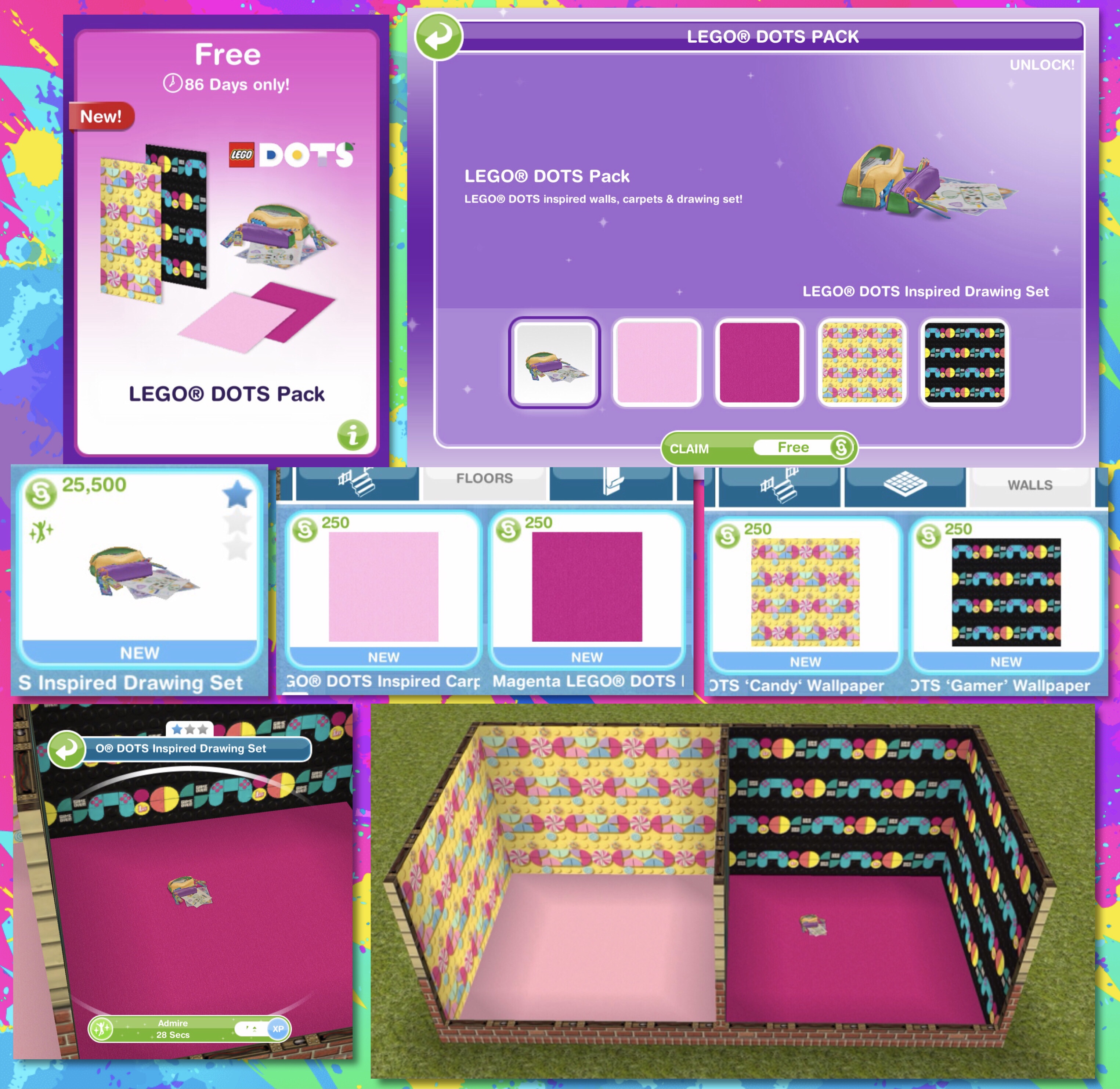 The Sims Freeplay and LEGO® DOTS are partnering together in an exclusive update. LEGO® DOTS will take over SimTown with a limited time LEGO® DOTS x The Sims Live Event and free LEGO® DOTS pack from 13th June- 24th July 2022. Complete to unlock LEGO® DOTS inspired items and if you complete the whole event in the time limit you unlock the You DOT You house template. This event is available for the entire update but once you load the game the time limit will begin, this event is only here for 7 days (it is shorter than normal live events but doesn’t require as many arts and crafts items) and the aim of it is to collect enough arts and crafts items from the arts and crafts stations (found in the event tab of buy mode) to unlock all the items in this event.