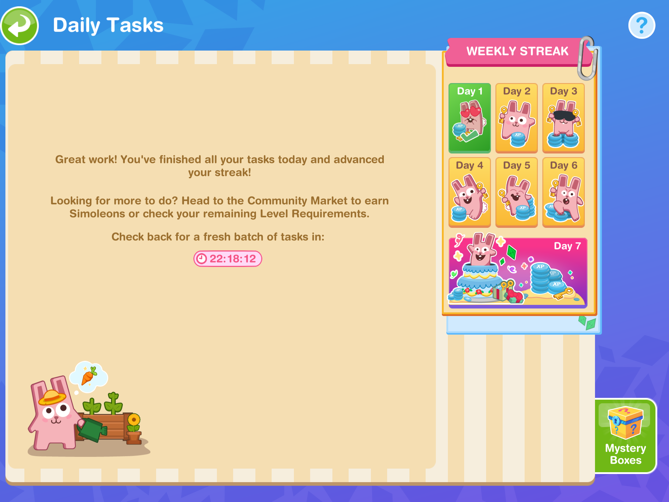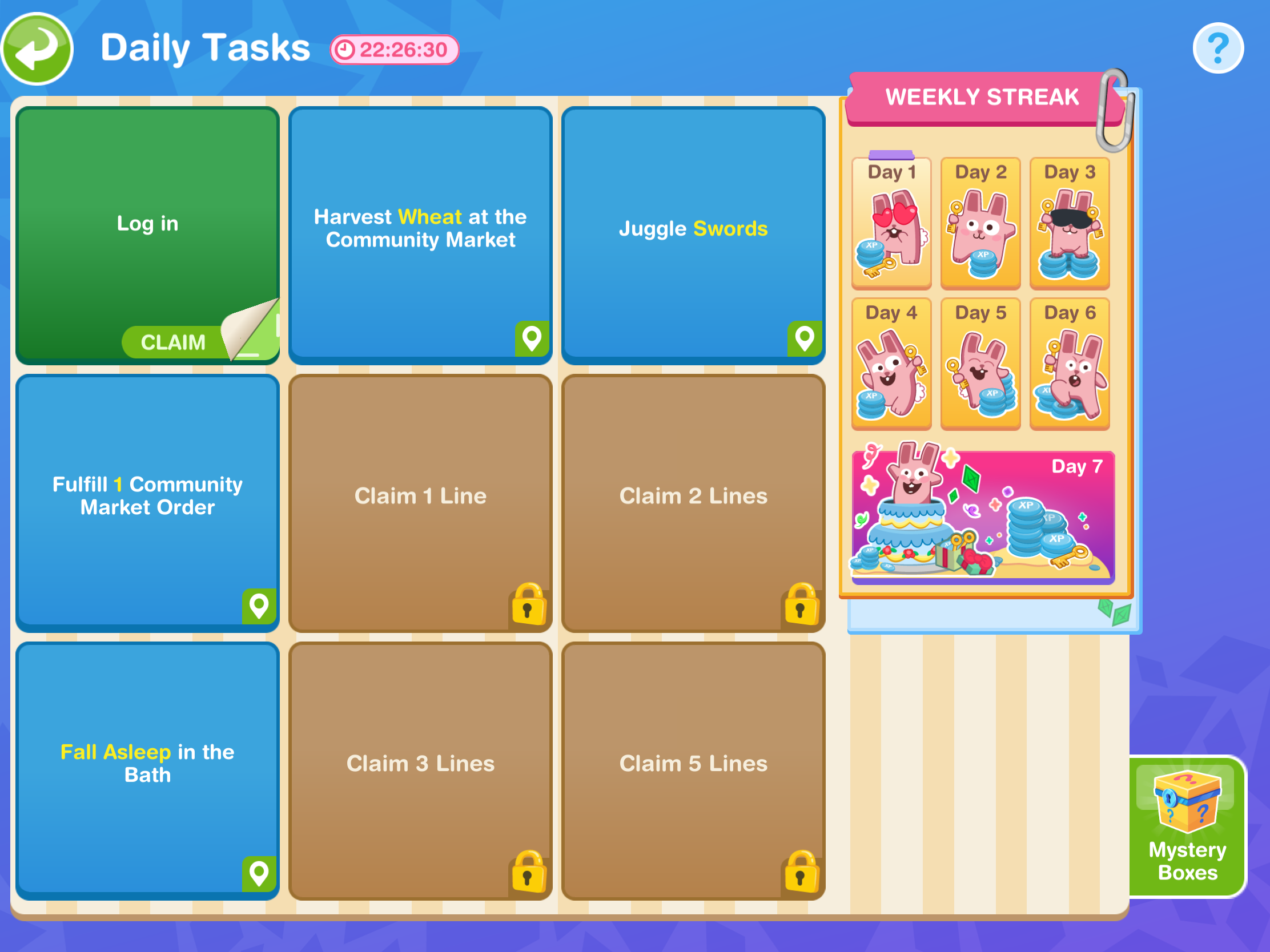 - Wait for day 7 (come back tomorrow for the next set of goals, you need to wait a certain amount of time to start the next set, the time depends on when you completed the sixth set but you can start the next day early by skipping the day break for a large amount of social points) NOTE: you will not get this goal if you are behind in completing the goals, it will go straight to the next goal once you complete the sixth set