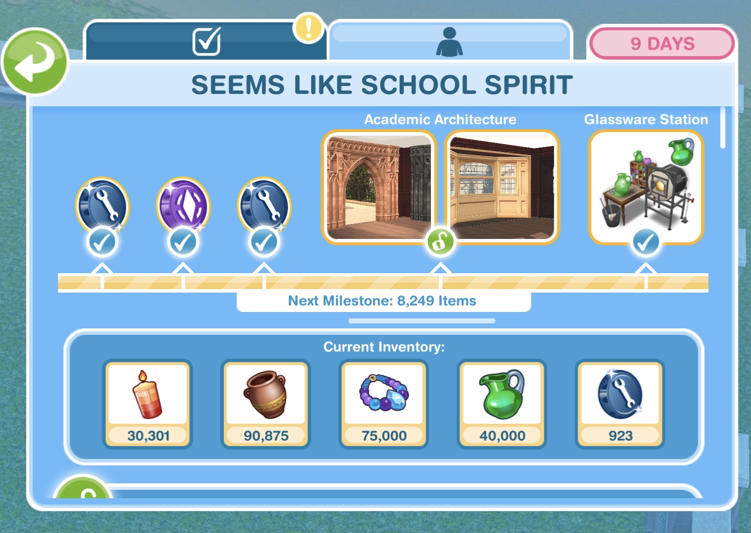 - Wait for day 9 (come back tomorrow for the next set of goals, you need to wait a certain amount of time to start the next set, the time depends on when you completed the eighth set but you can start the next day early by skipping the day break for a large amount of social points) NOTE: you will not get this goal if you are behind in completing the goals, it will go straight to the next goal once you complete the eighth set